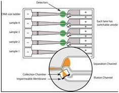 運(yùn)行中,軟件通過實(shí)時(shí)光路檢測(cè),和參考泳道中的DNA ladder進(jìn)行比對(duì),確定已經(jīng)設(shè)置回收長度范圍的DNA片段到達(dá)洗提泳道(elution channel)的準(zhǔn)確時(shí)間
