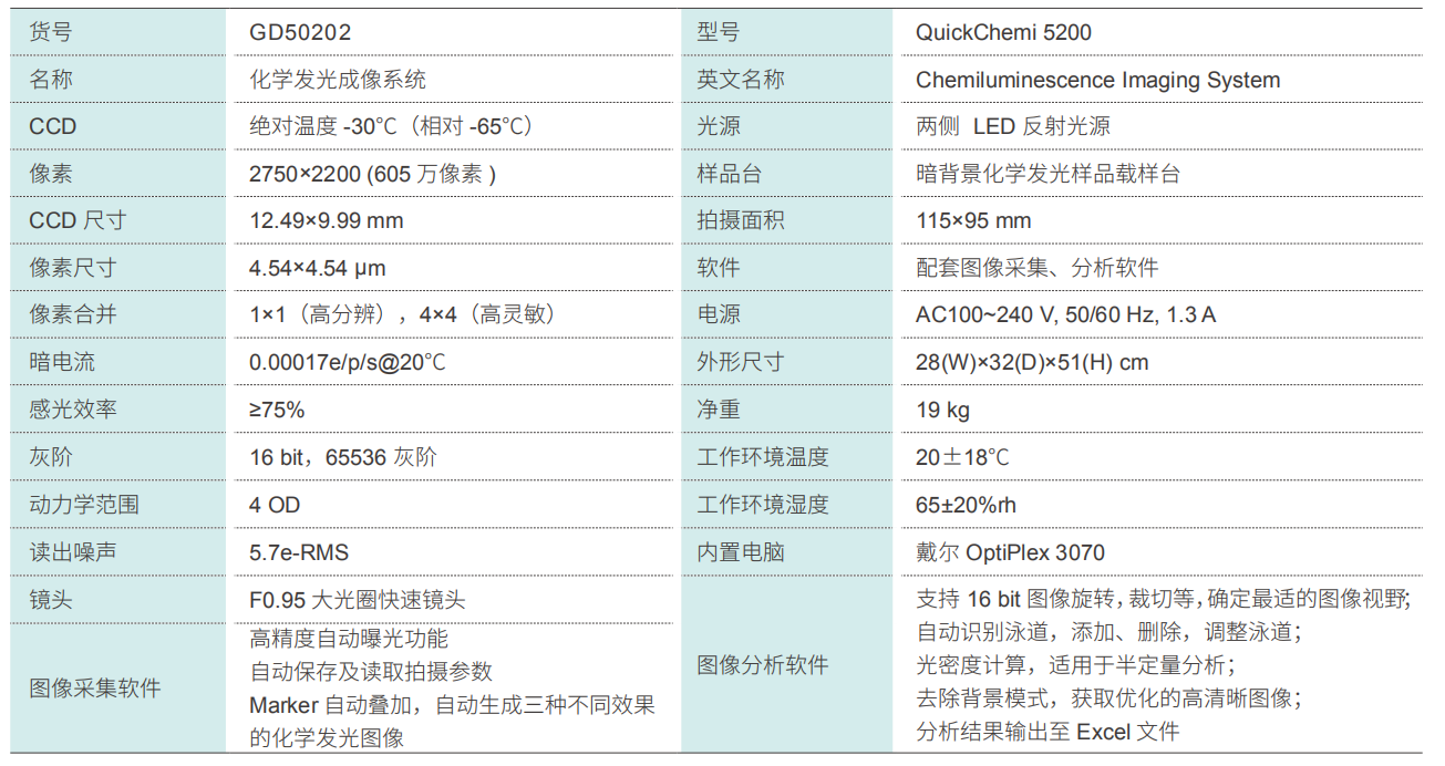 Quickchemi 5200化學(xué)發(fā)光成像系統(tǒng)適用于ECL發(fā)光直接成像,采用三級(jí)深度制冷CCD作為感光芯片,最大程度降低暗電流,提高信噪比。像素值高達(dá)605萬,并具有極高感光效率,結(jié)合F0.95大光圈鏡頭,收集微弱信號(hào)能力更強(qiáng),成像效果更好,速度更快,且線性范圍更寬。特殊設(shè)計(jì)的防銹機(jī)身,簡單大方耐腐蝕;外接 24 寸大屏顯示器,強(qiáng)大的拍攝及分析軟件,操作簡單便捷,拍攝不同信號(hào)強(qiáng)度樣品時(shí),能自動(dòng)匹配拍攝參數(shù),實(shí)現(xiàn)“一鍵成像”。