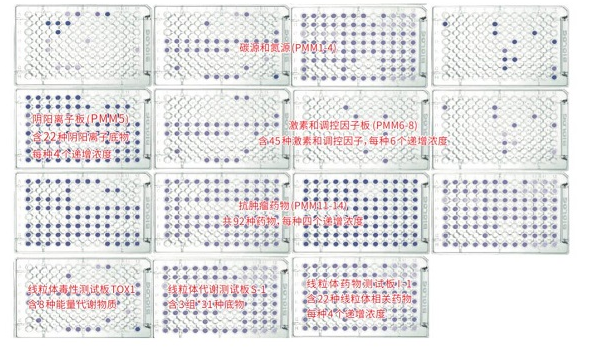 PMM另一核心技術(shù)為15種PMM板和三種接種液,PMM板每個孔固定不同的底物,對應(yīng)不同的研究目的。用戶只需按常規(guī)的細胞培養(yǎng)技術(shù),加不同的細胞懸液到不同的PMM板上,然后上機檢測。